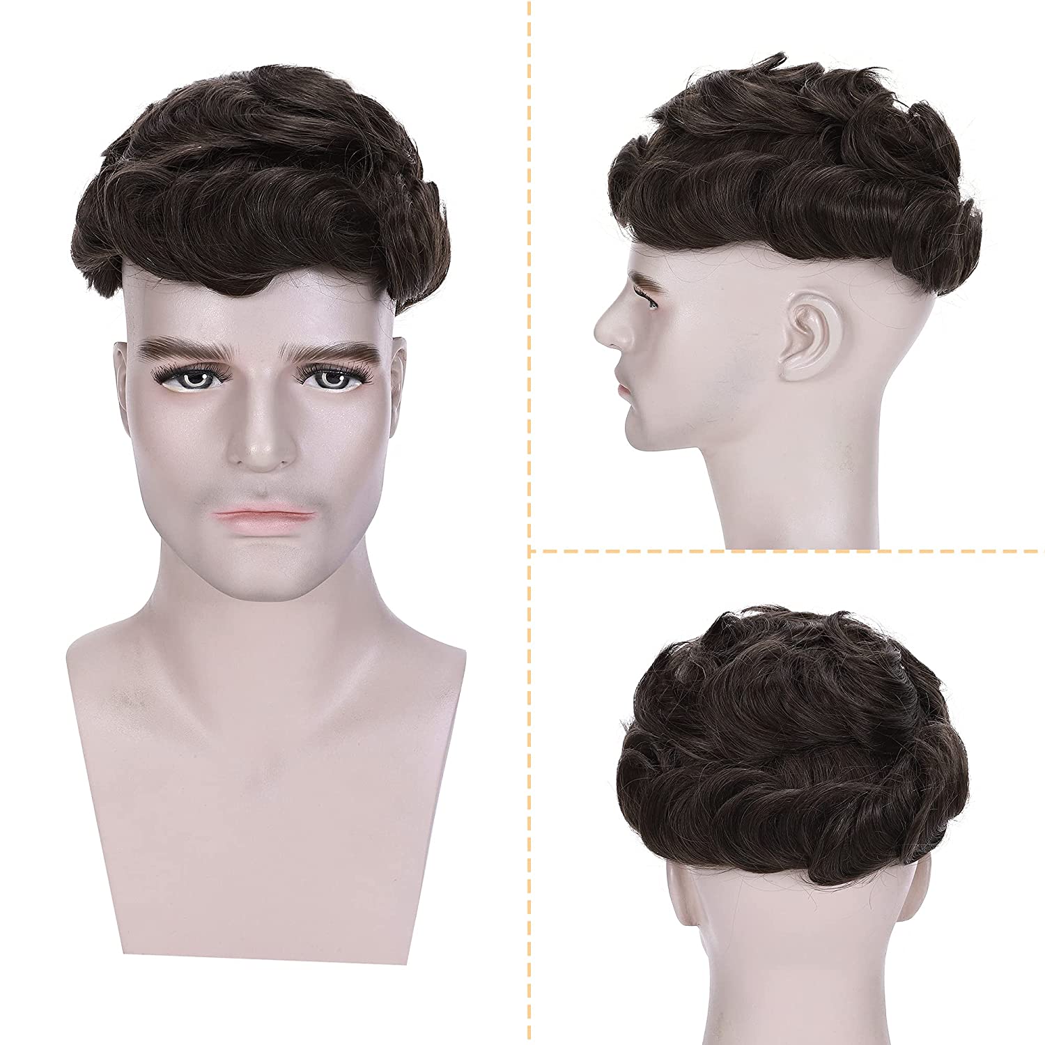 N.L.W. Curly Swiss Lace Mens Toupee Human Hair Topper Hairpiece for Men 8×10 Full French Lace System Indian Virgin Human Hair 130% Density 6“ Long Curly Men’s Hairpiece Replacement Wig